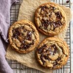 These Browned Butter Toffee Chocolate Chip Cookies boast a rich, nutty flavor achieved by browning the butter to bring out deep caramel notes. Combined with dark and semisweet chocolate, homemade or store-bought toffee bits, and a touch of flaky sea salt for finishing, these cookies deliver the perfect balance of sweet, salty, and buttery goodness. The dough’s 24-72 hour refrigeration enhances flavor and texture, resulting in irresistible, chewy cookies with a golden crust.