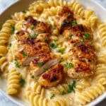 This Cheesy Cajun Garlic Chicken Rotini Skillet is a creamy, flavorful one-pan meal featuring tender Cajun-seasoned chicken, perfectly cooked rotini pasta, and a rich blend of mozzarella, Parmesan, and cheddar cheeses. The dish is simmered in a garlicky, creamy sauce that brings a perfect balance of spice and comfort, finished with fresh parsley for a touch of brightness.