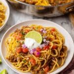This Cheesy Taco Spaghetti combines the bold flavors of taco seasoning with comforting pasta, ground beef, and melty cheddar cheese. A one-pan meal that’s easy to prepare, perfect for a delicious weeknight dinner with a Tex-Mex twist.