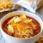 A hearty and flavorful Chicken Enchilada Chili combining tender chicken, black beans, corn, and enchilada sauce, simmered together to create a perfect fusion of chili and Mexican flavors. This easy-to-make dish is topped with melted cheddar cheese and crunchy chili cheese Fritos for the ideal comforting meal.