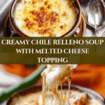 This Chile Relleno Soup recipe is a comforting and flavorful dish inspired by the classic Mexican chile relleno. Roasted poblano peppers are blended into a creamy chicken soup, enriched with cream cheese and cheddar, then finished with a broiled cheese topping for a deliciously cheesy crunch. Perfect as a hearty lunch or dinner, this soup combines smoky, spicy, and creamy elements in every bite.