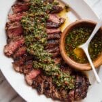 Keywords: chimichurri, flank steak, steak marinade, argentinian steak, cast iron skillet steak, grilled steak alternative, herb sauce, garlic steak