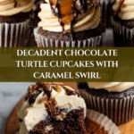 Decadent Chocolate Turtle Cupcakes featuring moist chocolate coffee-infused cake, rich caramel buttercream frosting with a caramel swirl, topped with luscious chocolate ganache and roasted pecans for a perfect blend of flavors and textures.