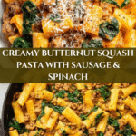 Keywords: butternut squash pasta, creamy pasta sauce, Italian sausage pasta, spinach pasta, fall pasta recipe, comfort food, easy dinner