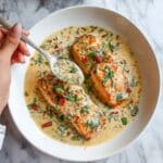 The image shows two cooked chicken breasts in a creamy white sauce with green herbs and small bits of red, possibly peppers or tomatoes. The chicken breasts are golden brown with a slightly crispy outside, sitting in a smooth, thick sauce with visible green leafy herbs on top and around them. A silver spoon held by a woman's hand is scooping some of the sauce. The background is a white marbled texture. Photo taken with an iphone --ar 4:5 --v 7