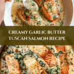 Creamy Garlic Butter Tuscan Salmon is a rich and flavorful dish that combines tender salmon fillets with a luscious garlic butter sauce, fresh spinach, and sun-kissed cherry tomatoes. This easy-to-make recipe brings a touch of Italian flair to your dinner table in just 25 minutes.