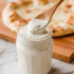 A clear glass jar filled with thick, white creamy sauce shows texture with small visible bits, likely herbs or spices, inside the cream. A wooden spoon rests on top of the jar with a dollop of the sauce on it, appearing smooth and rich. In the blurred background, there is a white pizza crust with golden brown baked areas, sitting on a wooden cutting board. The setting is on a white marbled surface. photo taken with an iphone --ar 4:5 --v 7