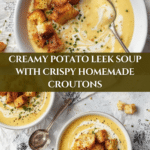 Keywords: potato leek soup, creamy soup, homemade croutons, sourdough croutons, comfort food, vegetarian soup, easy soup recipe