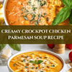 A comforting and rich Crockpot Chicken Parmesan Soup featuring tender chicken breasts simmered in a flavorful tomato broth with Italian herbs, creamy cheese, and pasta. This slow-cooked recipe combines all the classic flavors of Chicken Parmesan in a hearty, easy-to-make soup perfect for a cozy meal.