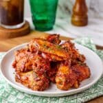 A white plate holds a stack of glossy, reddish-orange chicken wings coated in a thick, sticky sauce. The wings are piled in about two layers, with some wings overlapping others, showing crispy skin underneath the sauce. Small green herb pieces are sprinkled on top for color contrast. The plate is placed on a green and white patterned cloth, which is on a wooden surface. In the background, there are two green glasses stacked together and a tall glass filled with a dark iced drink beside a wooden pepper grinder, all set on a white marbled surface. photo taken with an iphone --ar 4:5 --v 7