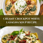 A comforting and creamy Crockpot White Lasagna Soup featuring tender shredded chicken, sun-dried tomatoes, spinach, and broken lasagna noodles in a savory broth enriched with Parmesan and ricotta cheeses. This slow cooker recipe is perfect for an easy weeknight meal with classic Italian flavors in a warm, hearty soup.