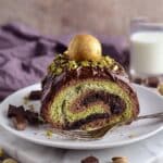 A slice of rolled cake sits on a white plate with a silver fork beside it, placed on a white marbled surface. The cake has three visible layers: a dark brown chocolate sponge layer on the outside, a green pistachio sponge swirl inside, and a thin dark chocolate filling swirled between the layers. The cake is topped with a thick layer of smooth chocolate cream, which is covered by a glossy dark chocolate glaze that drips slightly down the sides. A round golden-brown ball sits on top, garnished with small pieces of pistachio nuts scattered over the glaze. Around the plate are small chocolate cubes and whole pistachio nuts. In the back, a glass of white milk and a purple cloth are softly blurred against a neutral, textured backdrop. Photo taken with an iphone --ar 4:5 --v 7
