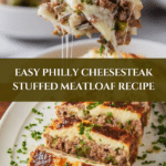 This Easy Stuffed Philly Cheesesteak Meatloaf combines classic Philly cheesesteak flavors with a comforting meatloaf twist. Ground beef is mixed with sautéed peppers, onions, mushrooms, and seasoned with a blend of spices, then stuffed with thick slices of mozzarella cheese. Baked to perfection with a cheesy topping, this hearty dish is perfect for a family dinner or a cozy meal.