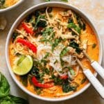 This Easy Thai Chicken Curry Soup is a flavorful and comforting dish featuring tender chicken, aromatic Thai red curry paste, creamy coconut milk, and fresh herbs simmered together with rice noodles in a savory broth. Perfect for a quick, satisfying weeknight meal with a vibrant balance of spicy, tangy, and herbal flavors.