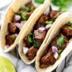 Keywords: Mexican street tacos, skirt steak tacos, quick tacos, easy Mexican recipe, skillet tacos, marinated steak tacos