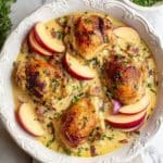 Keywords: French chicken casserole, chicken with apples, baked chicken casserole, apple cider chicken, bacon chicken casserole, comforting chicken dish