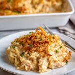 A white plate holds a creamy orzo pasta dish with tender pieces of chicken mixed throughout. The orzo is coated in a rich, light beige sauce giving it a smooth texture. On top, there is a layer of golden brown crispy fried onions adding crunch and contrast. Small bits of green herbs are sprinkled over the dish for a fresh touch. In the background, a white baking dish filled with more of the orzo chicken mixture is slightly blurred. A silver fork is placed beside the food on the plate, all set on a white marbled surface. Photo taken with an iphone --ar 4:5 --v 7