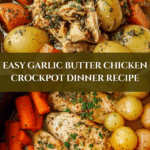 This Garlic Butter Chicken Crockpot Recipe is a simple, comforting meal perfect for busy days. Tender chicken, baby potatoes, and carrots cook slowly in a rich garlic butter sauce, filling your home with irresistible aromas.