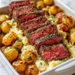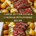 This Garlic Butter Steak & Cheddar Potato Bake is a savory and satisfying dish featuring tender ribeye or sirloin steaks layered with thinly sliced russet potatoes, sharp cheddar cheese, and a fragrant garlic butter sauce seasoned with thyme and rosemary. It combines seared steak with a comforting baked potato casserole, making a perfect hearty meal for any occasion.