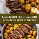 Keywords: garlic butter steak, skillet steak and potatoes, baby potatoes, flank steak recipe, one pan meal, easy steak dinner, garlic herb butter sauce, quick steak recipe