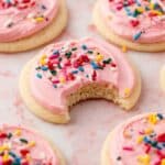 The image shows round soft sugar cookies with a smooth pink frosting layer spread evenly on top. Each cookie is decorated with colorful sprinkle pieces in red, blue, yellow, green, white, and pink scattered across the frosting. One cookie in the center has a bite taken out, revealing a soft, crumbly inside with light beige color. The cookies are placed on a white marbled texture background, and their edges are golden brown, highlighting a soft texture. photo taken with an iphone --ar 4:5 --v 7
