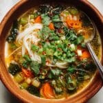 This healing ginger garlic broth with rice noodles is a comforting and nourishing dish perfect for soothing your body and soul. Packed with fresh vegetables, warming spices, and vibrant greens, it’s easy to make and wonderfully satisfying.