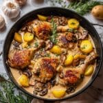 This Herb Roasted Chicken in Creamy White Sauce with Mushroom and Potatoes recipe offers a comforting and flavorful one-pan meal. Juicy bone-in chicken thighs are seasoned with aromatic herbs and seared to perfection, then baked alongside tender baby potatoes and mushrooms in a luscious creamy white sauce. It’s an easy, elegant dish perfect for family dinners or entertaining guests.