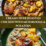 Keywords: herb roasted chicken, creamy white sauce, mushroom chicken recipe, roasted baby potatoes, easy chicken dinner, one pan chicken recipe