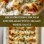 These High Protein Chicken Enchiladas with White Sauce combine tender shredded chicken seasoned with spices and wrapped in whole wheat tortillas, smothered in a creamy Greek yogurt-based white sauce, and baked to bubbly perfection. This nutritious and flavorful dish offers a high-protein, wholesome twist on classic enchiladas, perfect for a healthy family dinner.