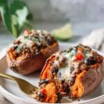 This High Protein Ground Turkey Stuffed Sweet Potato recipe combines tender, flavorful sweet potatoes with a savory mix of lean ground turkey, fresh vegetables, and spices. Enhanced with black beans and corn for extra protein and fiber, and finished with melted sharp cheddar cheese, this dish is a satisfying, nutritious meal perfect for a wholesome lunch or dinner.