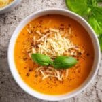 - Serve and Garnish: Pour the blended soup back into bowls. Season with pepper, and garnish with grated parmesan and fresh basil if desired. Serve warm.