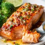 A close-up of two thick salmon fillet pieces on a white plate with a white marbled texture surface; the salmon is coated with a shiny, reddish-orange glaze with visible small bits of garlic and herbs, showing the flaky texture of the cooked fish inside. On the left side of the plate, there are bright green broccoli florets adding contrast, and a wedge of lime partly visible near the top left. The dish is garnished with finely chopped green herbs on top of the salmon, and a fork holds a small piece of salmon on the right side of the plate. The lighting makes the salmon look moist and glossy, emphasizing the texture and colors. photo taken with an iphone --ar 4:5 --v 7