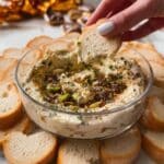 This dip pairs well with toasted baguette slices, crackers, pita chips, or fresh vegetable sticks like carrots and celery.