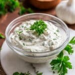 A clear glass bowl filled with thick, creamy white dip that has small green herb pieces mixed in. Fresh green parsley leaves are sprinkled on top for decoration. The bowl is placed on a white marbled surface with some fresh parsley sprigs nearby. In the background, there is a garlic bulb and a round wooden dish with black pepper, slightly blurred. Photo taken with an iphone --ar 4:5 --v 7