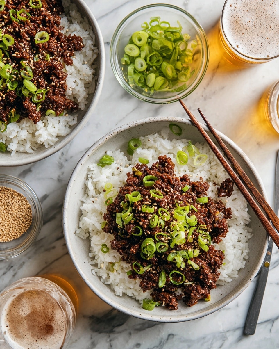 Keywords: Korean ground beef bowl, quick Korean recipe, beef rice bowl, easy weeknight dinner, Korean beef, soy sauce beef bowl