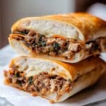 This Korean-Inspired Kimchi Bulgogi Cheesesteak combines the savory flavors of marinated beef sirloin with tangy kimchi and sautéed vegetables, all topped with melted provolone or American cheese on toasted hoagie rolls. A bold twist on the classic cheesesteak, this recipe marries Korean seasoning with American comfort food for a deliciously unique sandwich.