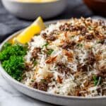 Lebanese Hashweh is a traditional Middle Eastern dish featuring fragrant basmati rice toasted with vermicelli pasta, cooked in spiced broth, and topped with a savory ground beef or lamb hash infused with Lebanese 7 spice and toasted pine nuts. This flavorful, aromatic one-pot rice pilaf with meat makes for a hearty and comforting meal perfect for family dinners or special occasions.