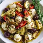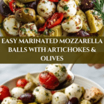 This marinated mozzarella balls, artichokes, and olives dish is a flavorful and easy appetizer perfect for summer gatherings or casual dinners. The combination of creamy mozzarella, tangy artichokes, and briny olives soaked in a herbed olive oil marinade creates a delicious bite every time.