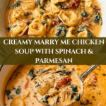 This Marry Me Chicken Soup recipe is a comforting and creamy dish packed with tender chicken, fresh vegetables, pasta, and a touch of Parmesan cheese. The soup is flavored with Italian seasoning, sun-dried tomatoes, and garlic, then finished with fresh spinach and heavy cream for richness. It’s perfect for an impressive yet easy weeknight meal that warms the soul.