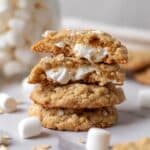 A close-up of a stack of four oat cookies broken in half, showing a soft golden-brown texture with gooey white marshmallow pieces melted inside each cookie layer, arranged on a white marbled surface with some rice cereal and mini marshmallows scattered around; in the blurred background, there is a clear jar filled with white mini marshmallows. Photo taken with an iphone --ar 4:5 --v 7