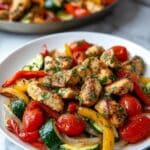 - Prep Ingredients: Gather and prepare all ingredients by cutting the chicken into bite-sized pieces, slicing the zucchini into half-moons, dicing the red bell peppers, slicing the red onion into strips, halving the cherry tomatoes and Kalamata olives, mincing the garlic, and chopping the sun-dried tomatoes. This ensures a smooth cooking process.
