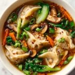 A comforting and flavorful Potsticker Soup featuring tender potstickers simmered in a savory broth infused with ginger, garlic, and sesame oil. Enhanced with optional vegetables like mushrooms and spinach, this easy-to-make soup is perfect for a cozy meal and can be customized to vegetarian preferences by using vegetable broth.