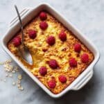 A white rectangular baking dish contains a golden-brown baked oatmeal with a slightly crispy edge and scattered red raspberries on top. The texture looks soft and slightly bubbly with some oats visible, creating a cozy, warm feeling. A metal spoon is placed inside the dish on the left side, ready to serve the oatmeal. The dish is placed on a white marbled surface with a few oat flakes scattered around. Photo taken with an iphone --ar 4:5 --v 7