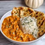 - Garnish and Serve: Optionally sprinkle with fresh coriander/cilantro leaves. Serve the butter chicken hot alongside basmati rice or white rice for a complete meal.