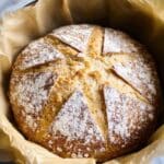 - Score and bake bread: Using a very sharp knife, score the top of the bread dough. Carefully transfer the dough with the parchment paper into the hot dutch oven. Bake for 30 minutes with the lid on, then remove the lid and bake for an additional 10 minutes to achieve a golden crust. If using a baking sheet, bake the bread for 35 minutes. The bread is done when the internal temperature reaches approximately 210°F (99°C).