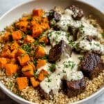 These Savory Butternut Squash & Garlic Herb Steak Bowls combine tender roasted butternut squash, perfectly seared steak cubes, and fluffy quinoa, all brought together with a creamy garlic herb sauce. This wholesome and flavorful dish is perfect for a nutritious and satisfying meal that’s easy to prepare.