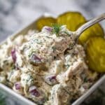 Keywords: dill pickle chicken salad, chicken salad recipe, easy chicken salad, creamy chicken salad, picnic recipes, sandwich filling, healthy chicken salad, yogurt chicken salad
