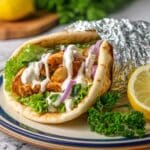 - Step 8: Assemble the pitas by layering the shredded chicken, yogurt sauce, sliced red onion, lettuce, cucumbers, and tomatoes. Serve warm and enjoy!