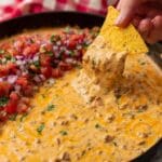 A close-up view of a creamy, orange-yellow cheese dip with visible bits of green herbs, chunks of meat, and a smooth, slightly chunky texture filling a black pan. On one side of the dip, there is a colorful salsa layer made of finely chopped red tomatoes, purple onions, and green herbs. A woman's hand is dipping a triangular yellow tortilla chip into the cheese dip, lifting some of the cheesy mixture with it. The background shows a white marbled texture with a red and white checkered cloth partially visible. Photo taken with an iphone --ar 4:5 --v 7