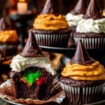 These Sorting Hat Surprise Cupcakes offer a magical twist on classic cupcakes. Each cupcake is filled with a hidden colored frosting representing one of the Hogwarts Houses—Gryffindor, Hufflepuff, Ravenclaw, or Slytherin—wrapped in a delicious chocolate frosting topping and decorated with mini fondant Sorting Hats, perfect for Harry Potter fans and themed parties.